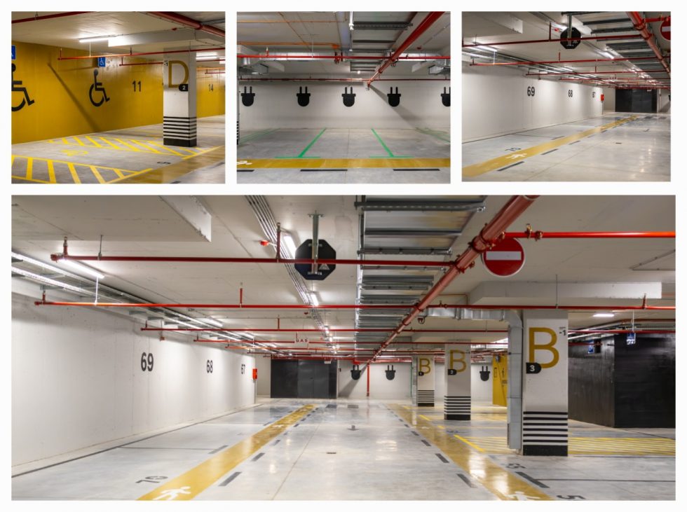 Унутар гараже су завршени сви грађевински радови који укључују и извођење инсталација, противпожарних система и система вентилације. Свака од приступних саобраћајница је ширине 5.5м, а јавни пешачки приступи у објекат гараже обезбеђени су кроз две степенишне вертикале. Степениште које има функцију улаза за ватрогасну интервенцију позиционирано је у северном делу објекта. На западном и источном степеништу, постављају се аутомати за наплату паркирања. У следили радови на инсталацијама и финални унутрасњи радови.